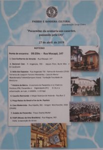 "PACAEMBU : da sesmaria aos casarões, passando pela City" Ponto de encontro: Rua Macapá. 147 - às 09:25 hs (pedimos a gentileza de não se atrasarem) ROTEIRO: Passeio e Bandeira Cultural - Pacaembu - abril de 2019
